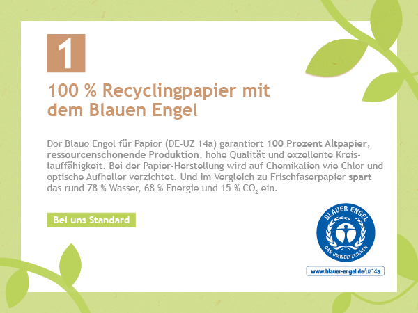 Für alle Produkte setzen wir (ohne Aufpreis) Blauer-Engel-Papier aus 100 % Recyclingpapier ein. Mit der Auswahl „Blauer-Engel-Logo“ unterstreichen Sie deutlich sichtbar Ihre nachhaltige Ausrichtung. Das Umweltzeichen erhalten Sie von uns in einer separaten E-Mail inkl. Leitfaden für die Verwendung.