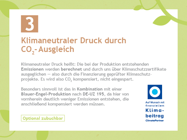 Wenn Sie diese Option buchen, übernehmen Sie zusätzliche Verantwortung für den Klimaschutz: Die CO₂-Emissionen Ihres Druckprodukts werden durch geprüfte Klimaschutzprojekte von ClimatePartner ausgeglichen – nachvollziehbar und transparent.